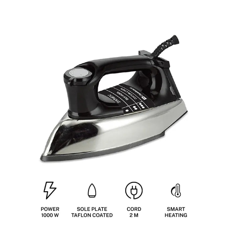 Type: Dry Iron Power: 1000W Smart Heating Energy Efficient Long working radius PTFE non-stick coated Anti-Scale Feature Voltage: 220-240V Frequency: 50Hz Dimensions: 26.5 cm (Width) x 13.5 cm (Depth) x 15 cm (Height)