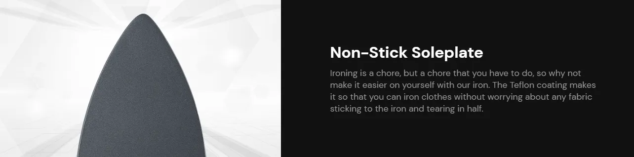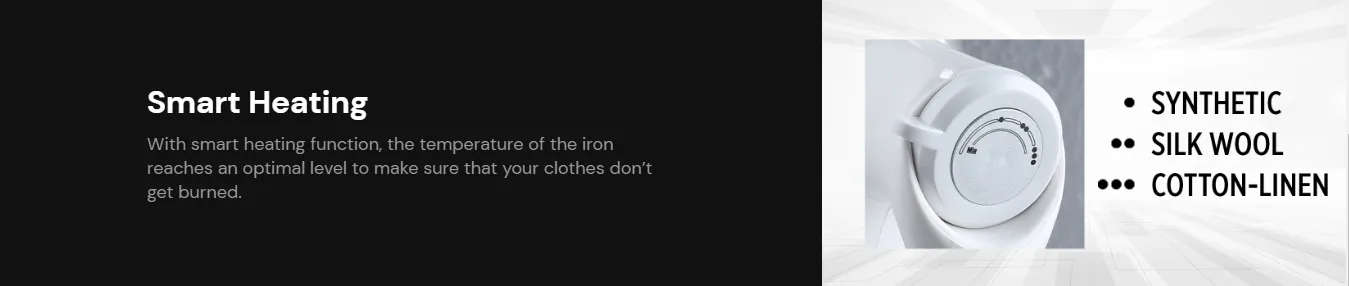 Power: 1000W provides proper heating for quick ironing. PTFE Non-Stick Soleplate: Ensures smooth gliding and prevents sticking to fabrics. Dry Ironing Capability: Perfect for a variety of clothing types. Manual Temperature: Customized heat settings for different fabrics. Anti-Scale Feature: Prevents mineral buildup from hard water, ensuring consistent steam output and extending the iron's lifespan. Smart Heating Technology: Designed to minimize power consumption while maintaining performance. Long Working Radius: Provides flexibility and ease of use during ironing sessions.