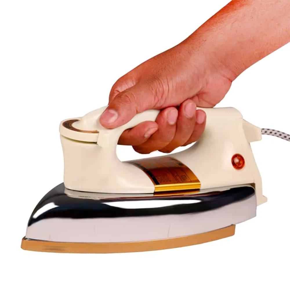 - Clean and well-ironed clothes portray your positive personality! So get your clothes perfectly ironed with the help of this amazing Dry Iron that effortlessly eliminate all the persistent creases. This heavy weight Traditional National iron has been the first choice of people since many years. Its price is also economical as compared to other brands and can perfectly iron any sort of cloth including cotton, silk, Rayon, lawn, etc.The indicator light of the iron guides you through the process and stops to indicate that the work is done