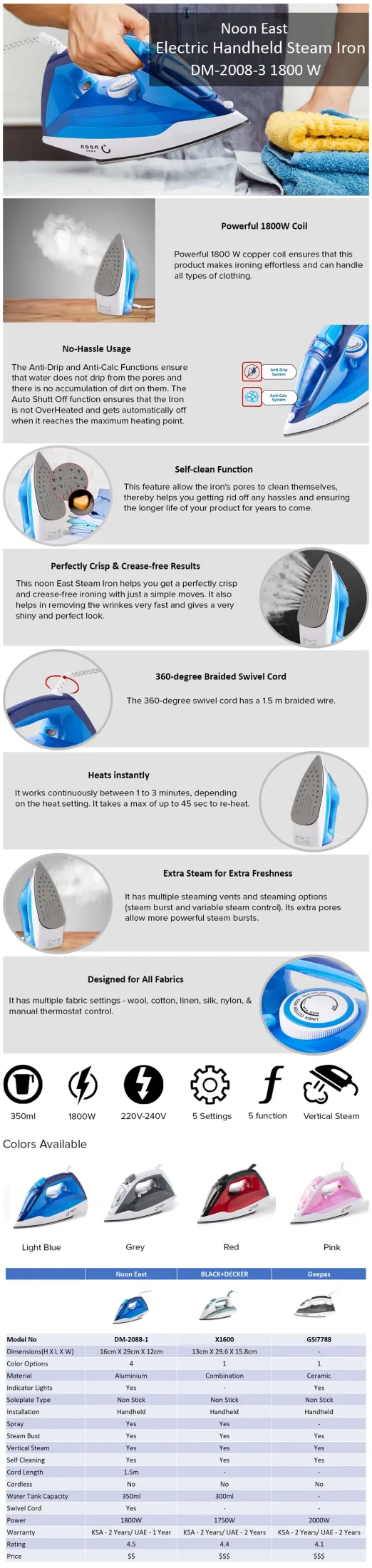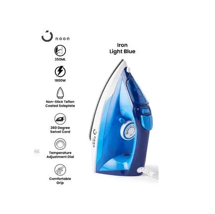 Specifications of Noon East Handheld Steam Iron - DM-2088-1 - Non-stick Teflon Coated Soleplate - 360 Degree Swivel Cord - Temperatre Adjustment Dial - Comfortable Grip - 350ml - 1800W - Light Blue
