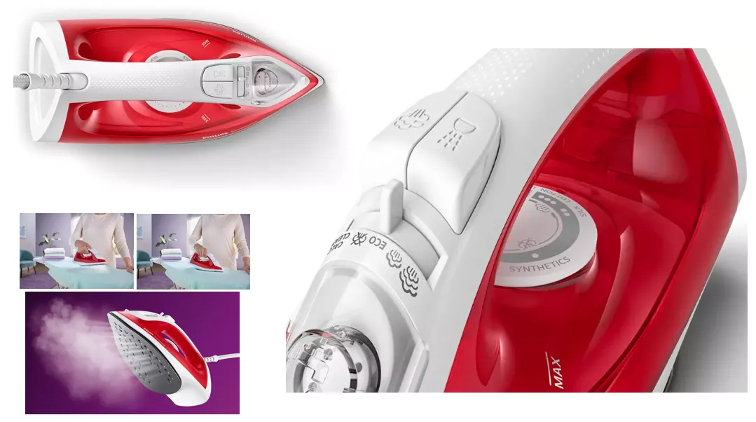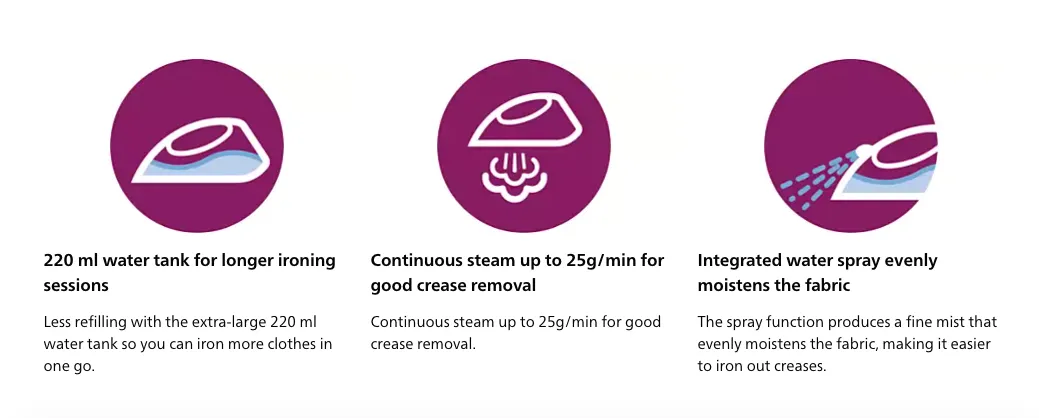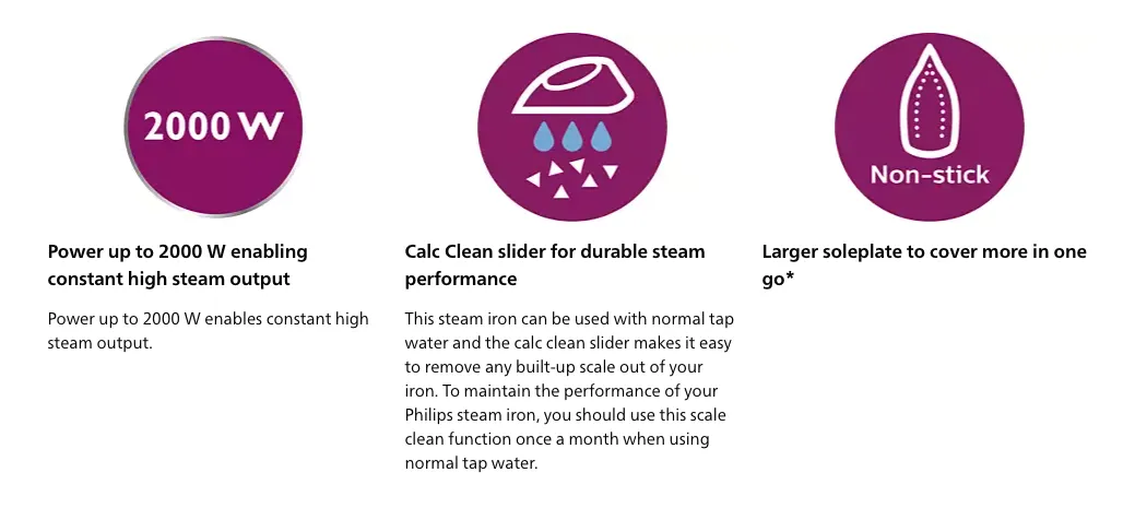 220 ml water tank for longer ironing sessions, Continuous steam up to 25g/min for good crease removal, Integrated water spray evenly moistens the fabric, Power up to 2000 W enabling constant high steam output, Calc Clean slider for durable steam performance, Larger soleplate to cover more in one go*, Wider hole for easy water filling*, Non-stick soleplate for easy and fast gliding on all fabrics, Triple precision tip to reach the most tricky areas, and with 2 Years of Brand Warranty.